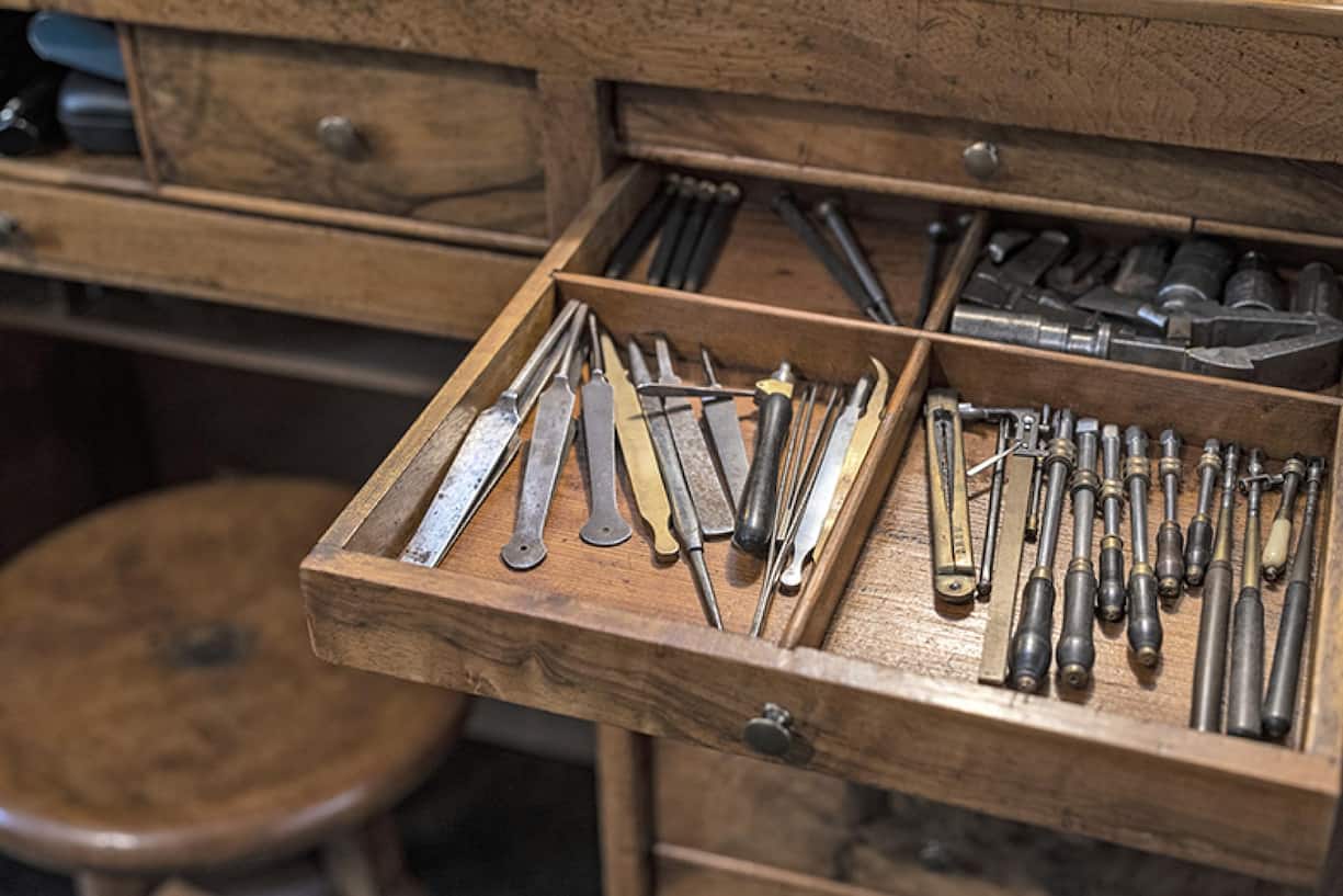 Chaque tiroir renferme un trésor, que seul l’artisan est capable de voir. Comme cette machine à raboter les dentures inventée par Ferdinand Berthoud, figure phare de l’histoire de l’horlogerie. Comme ces jeux de fraises à arrondir ou, plus rares encore, ces boîtes complètes de fraises Ingold, graal du pendulier. Ou cette collection unique de filières du XVIIIe siècle, qui servent à refaire les vis manquantes et les faire marcher dans les pas exacts de leurs ancêtres. L’œuvre d’une vie.