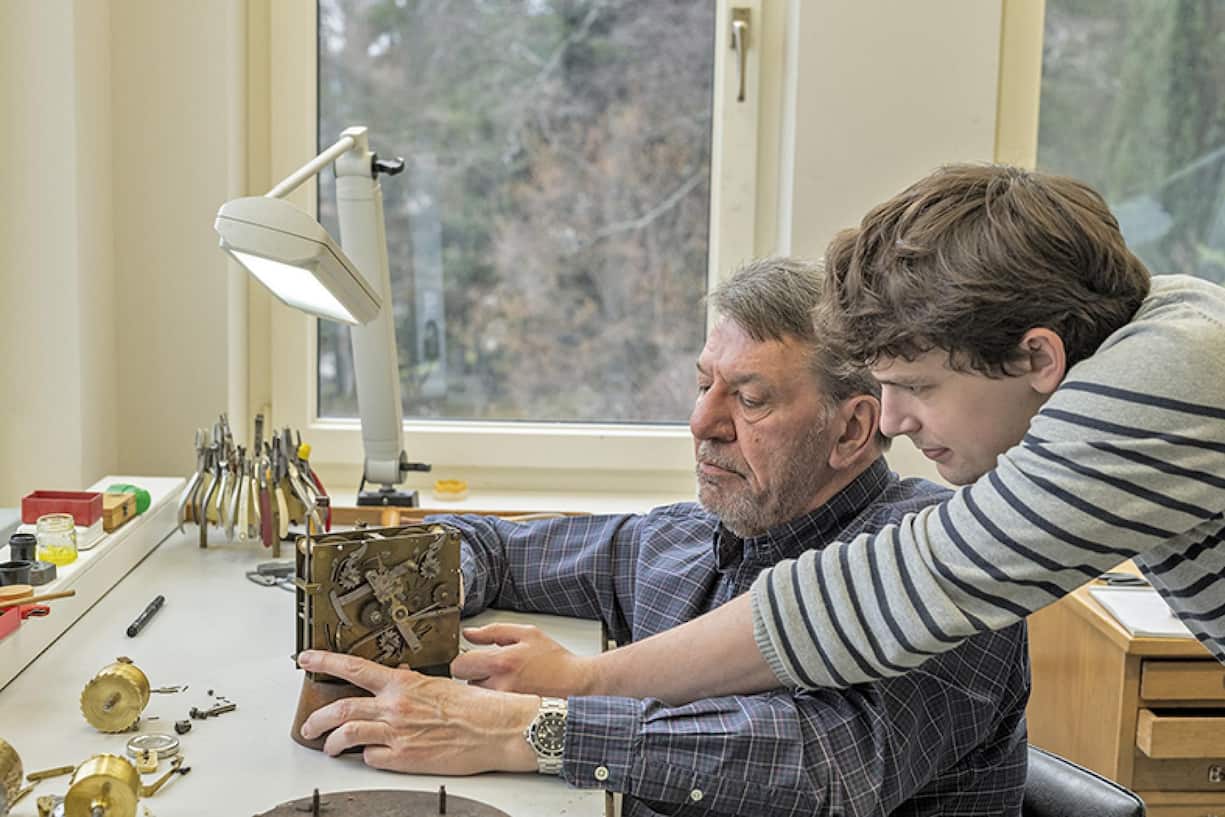 Ils ne sont que deux à l’atelier, pas plus, «ce n’est pas une usine». Et même son coéquipier, l’horloger Nicolas Uhl, 25 ans, dans l’atelier depuis trois ans et demi, a trouvé l’adresse par bouche à oreille. Des horloges, ici, il y en a partout. Des pièces muséales, des monuments vivants où s’écrit la longue quête de la mesure du temps. Mais ce n’est pas un musée, c’est une nurserie, un berceau, ces horloges sont venues ici pour renaître. Mécanique, habillage, matières, bois, métal, laiton, bronze, chaque détail fonctionnel ou décoratif. Auscultées, comparées, reclassées, restaurées, molécule par molécule. Jusqu’à l’indicible, jusqu’aux secrets que ces objets renferment, leur âme, leur histoire, le parcours de chaque pendule, patiemment reconstitué, date par date, geste par geste.