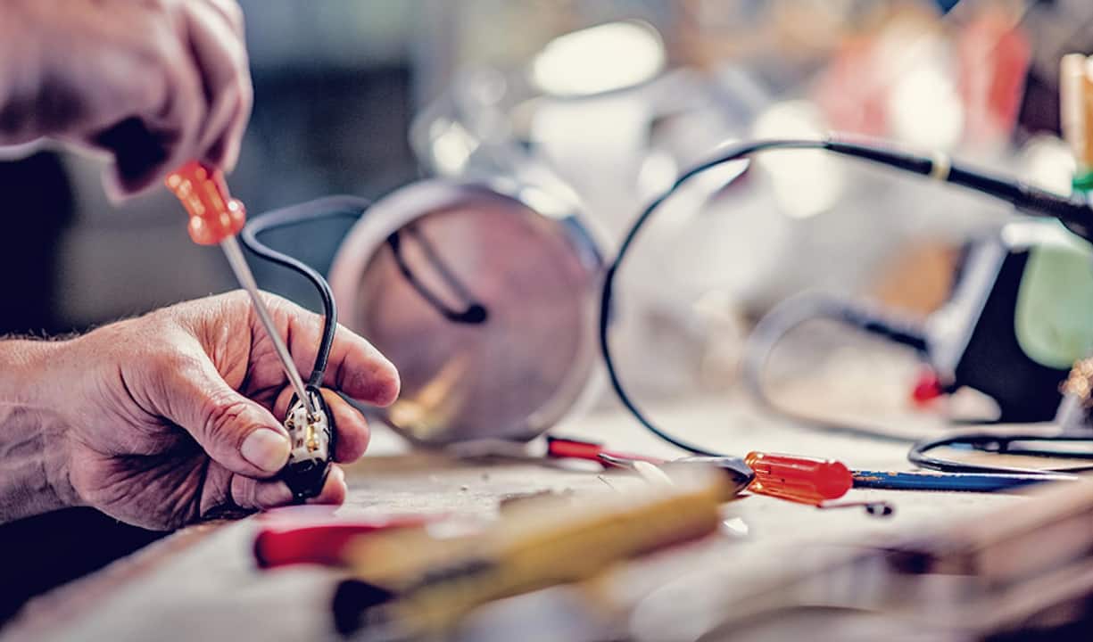 L’établi à tout faire, table des petites opérations, là où l’on soude, coupe, visse, remplace. Au centre de la table, le prototype d’une lampe à lumière constante inventée par Jacky Riesen.