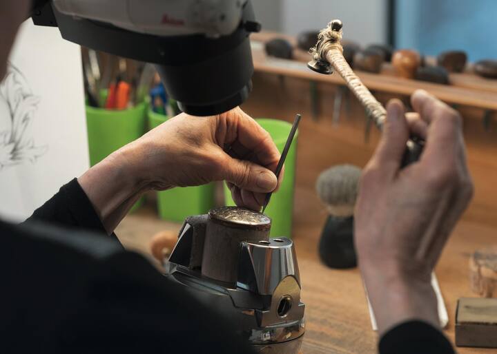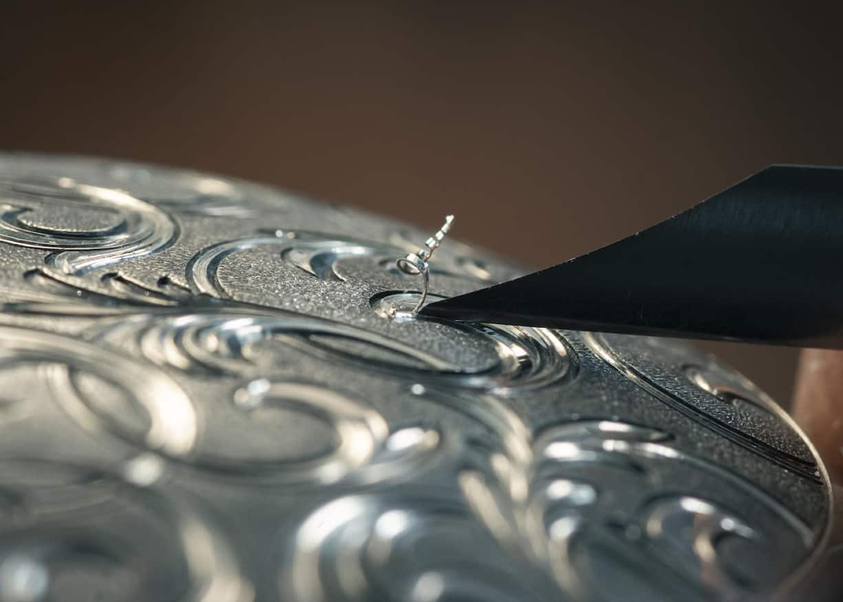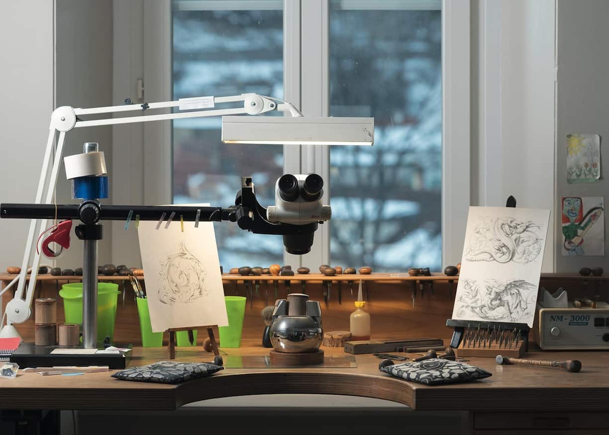 Il n’y avait rien d’autre à voir dans son atelier ce jour-là. Mais c’est sans doute à cela que l’on reconnaît l’atelier d’une graveuse: simple, sobre, un binoculaire, une poignée de burins et quelques petites machines pour les façonner. Une simplicité qui déconcerte et contraste avec le résultat final, le plus souvent des montres d’une grande complexité, technique et esthétique: décors de volutes, guilloché main, champlevé, bas-reliefs, taille-douce. Les nouvelles technologies n’ont d’ailleurs jamais franchi la porte de l’atelier. Tout est dans le dessin, tout est dans la main.