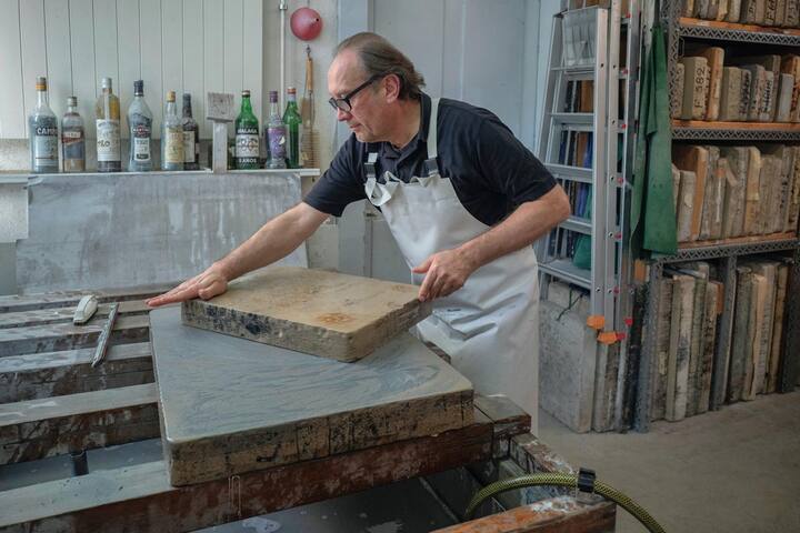 La lithographie commence par la préparation de la pierre, à la main, avec de l’eau et un peu de sable calibré qui donnera son grain au futur dessin.