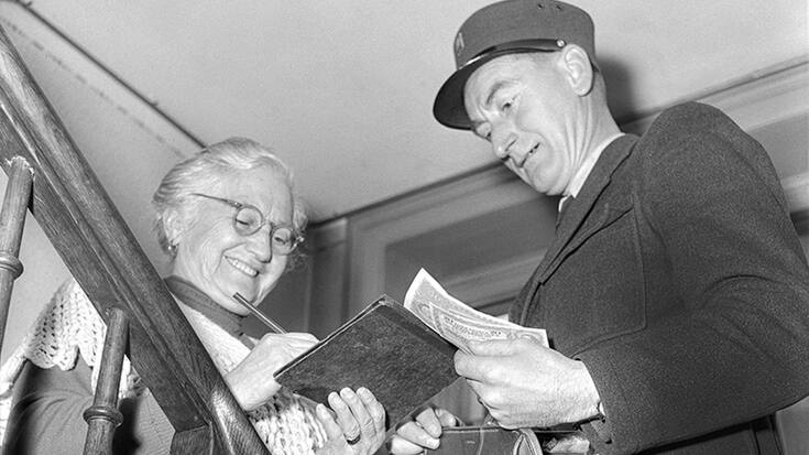 6 actifs/1 retraité: cette proportion date des années 1950 (ici, une femme qui reçoit son chèque AVS par le facteur). Aujourd’hui, le «rapport de dépendance» est de 3,4 actifs pour 1 retraité.