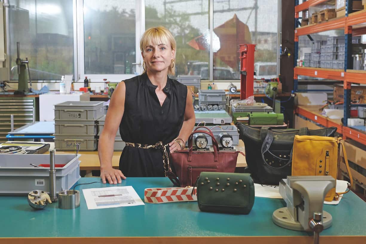 Chez BBN Mécanique, fabricant de broches pour l’industrie, elle s’occupe des offres, de l’information à la production et des clients, dans un domaine aussi technique que la mécanique. Il y a douze ans, elle a lancé sa marque de sacs V-Dolder et ouvert le concept store Trois marches au-dessus à Colombier (NE) avec deux amies.